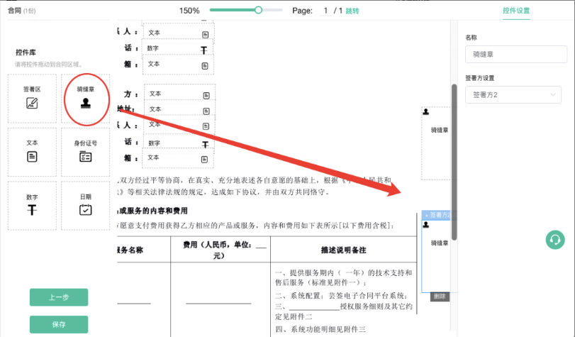 骑缝章位置固定为右边挂靠,可以上下移动位置;骑缝章放置需要与签署区一致,两个签署区对应两个骑缝章;盖章时是把公章拖到签署区,而不是骑缝章区。